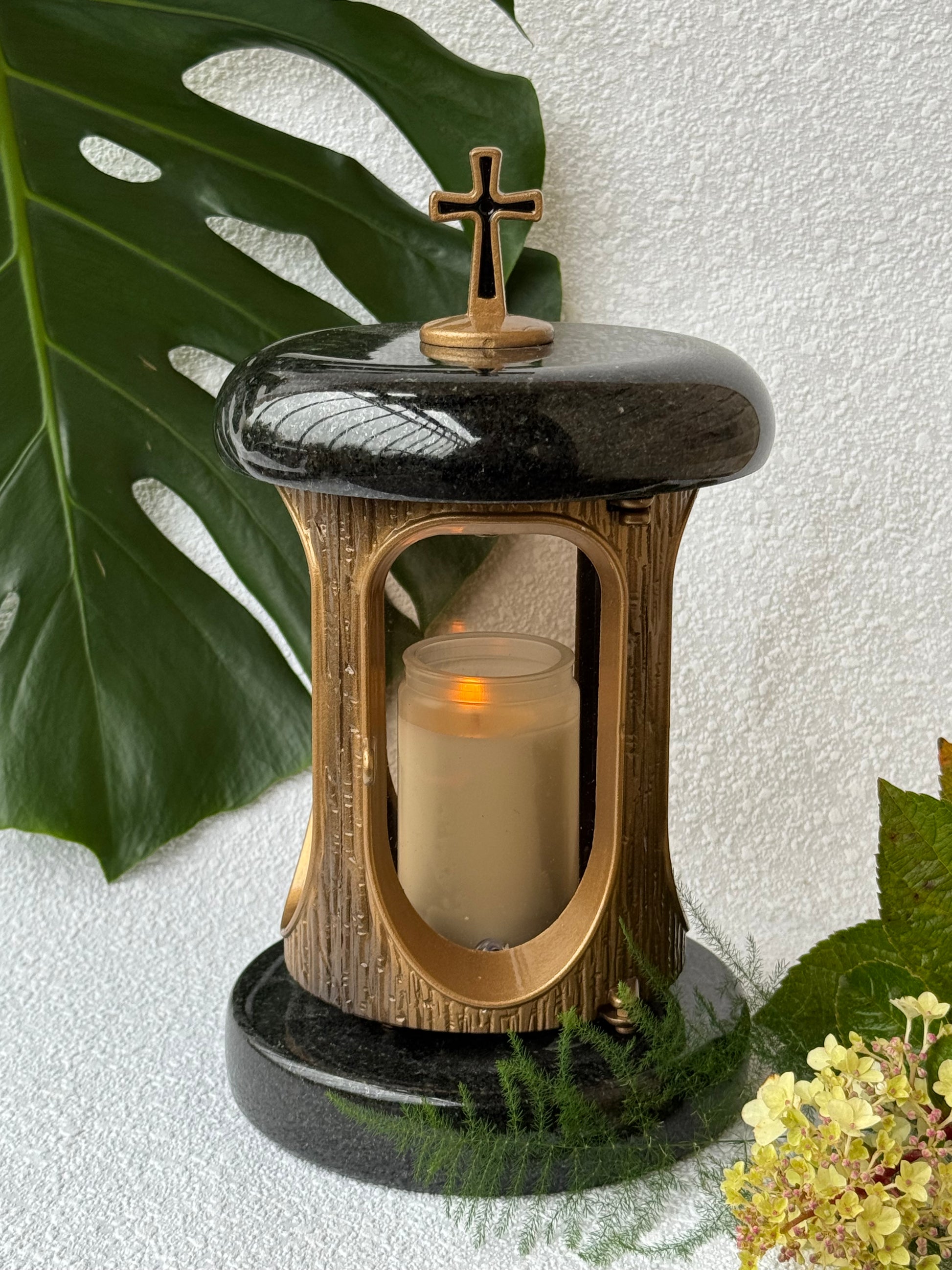 Glazūruotos juodos spalvos granitinis (natūralaus akmens) aukštos kokybės, tobulai išpjautas žibintas pritaikytas kapams su lietomis auksinėmis durelėmis bei kryželiu.