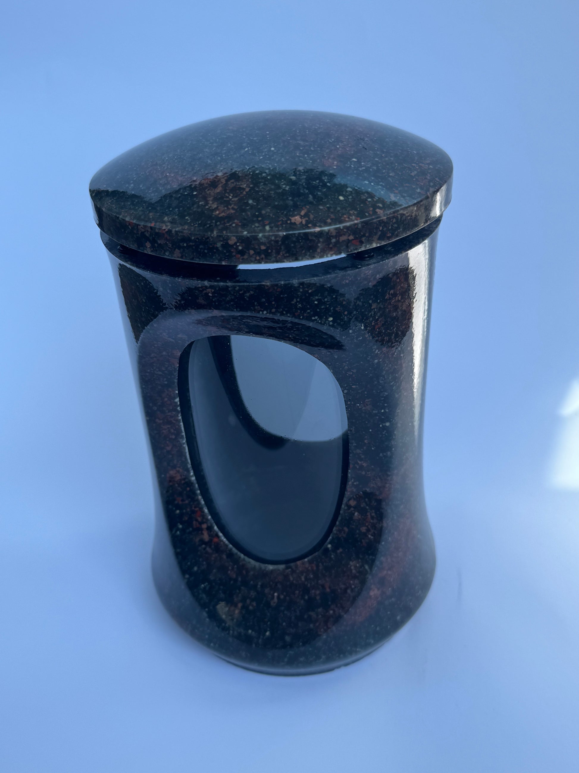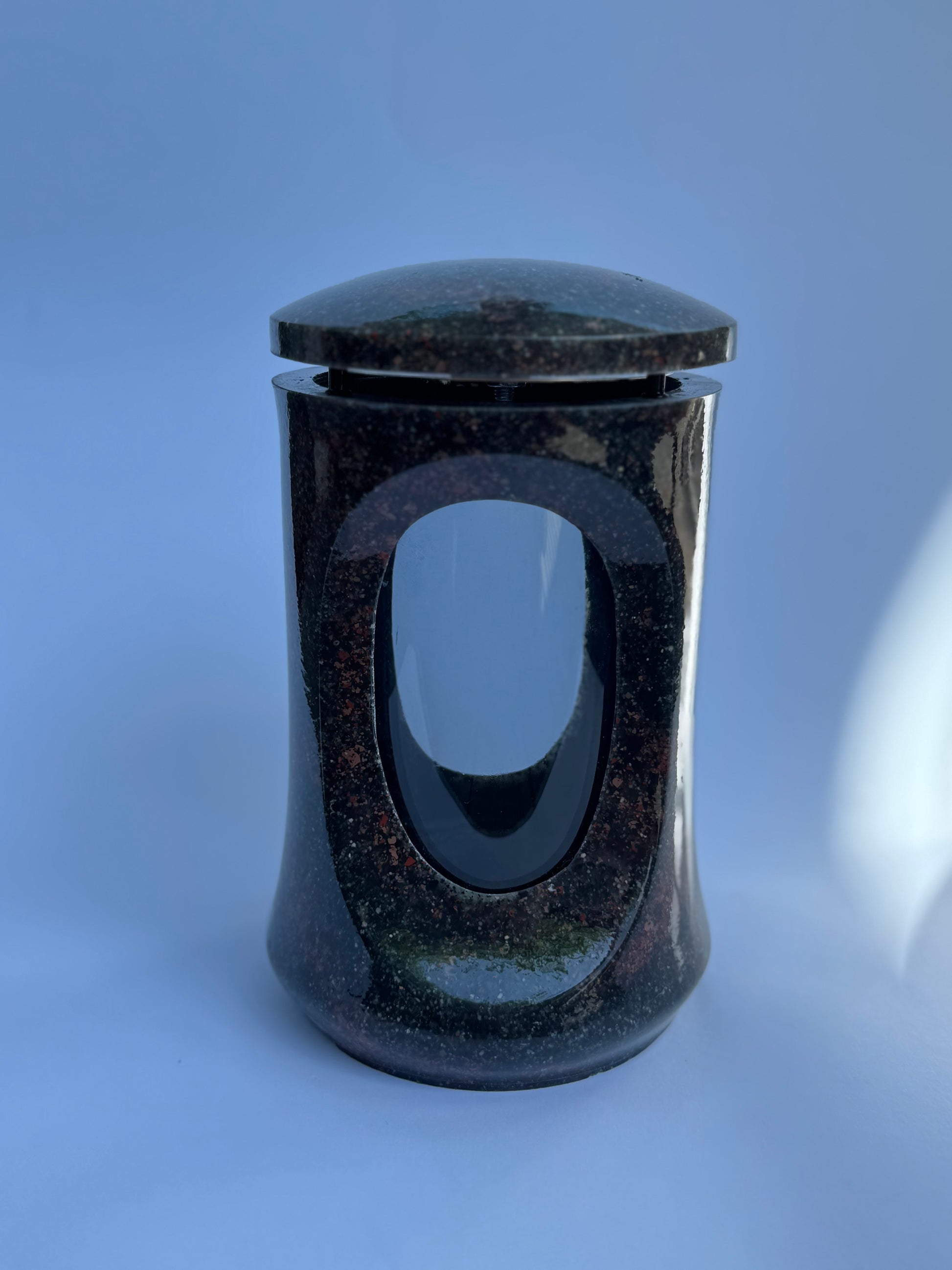 Ilgalaikio naudojimo, kokybiškas, auroros akmens spalvos akmens masės (lydinio) žibintas (žvakidė) skirta kapams su atspariu karščiui stiklu.
