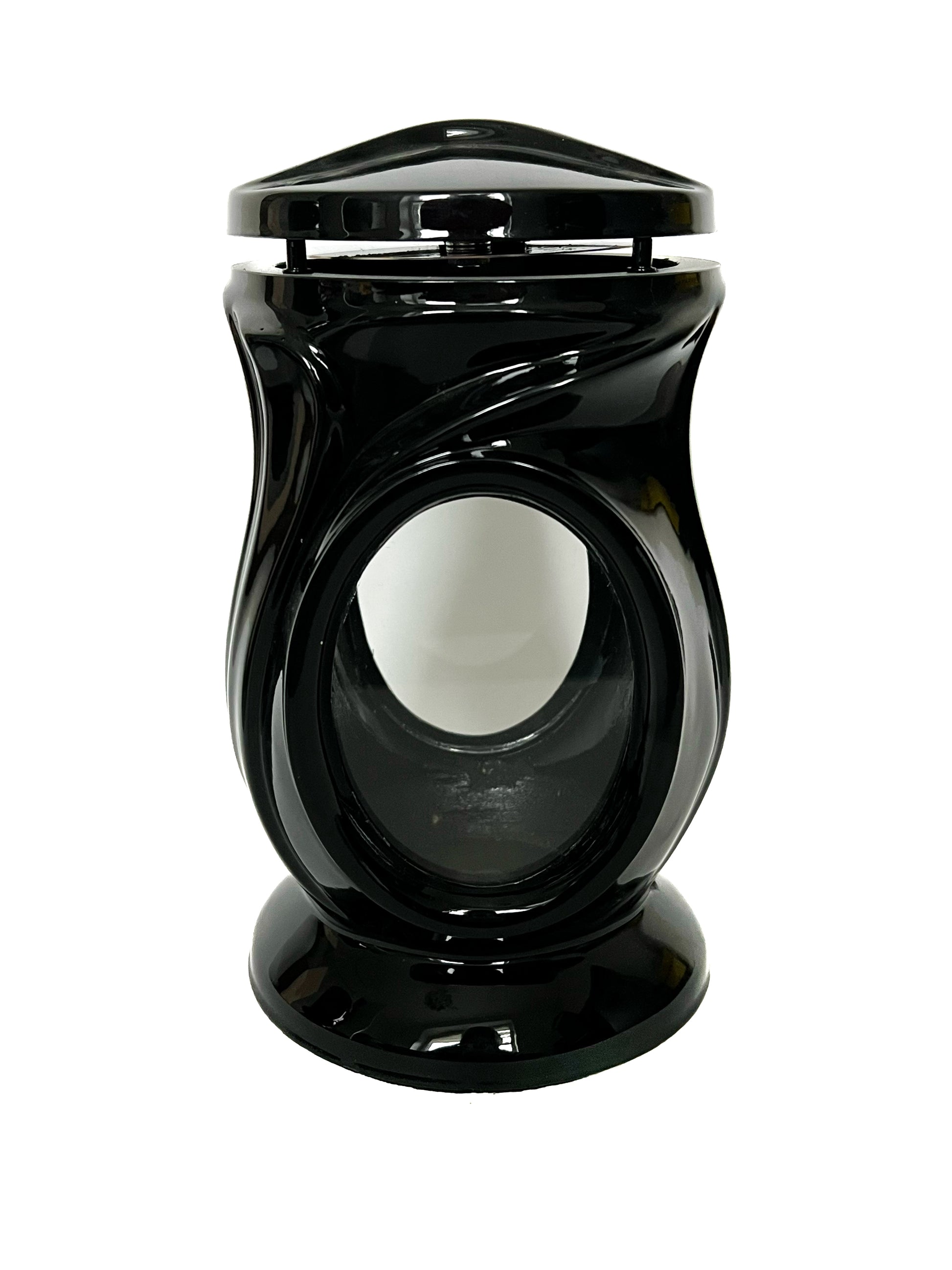 Atsparus šalčiui, ilgalaikio naudijimo, aukštos kokybės, juodos glazūruotos spalvos akmens masės (lydinio) žibintas (žvakidė) skirta kapams su atspariu karščiui stiklu.