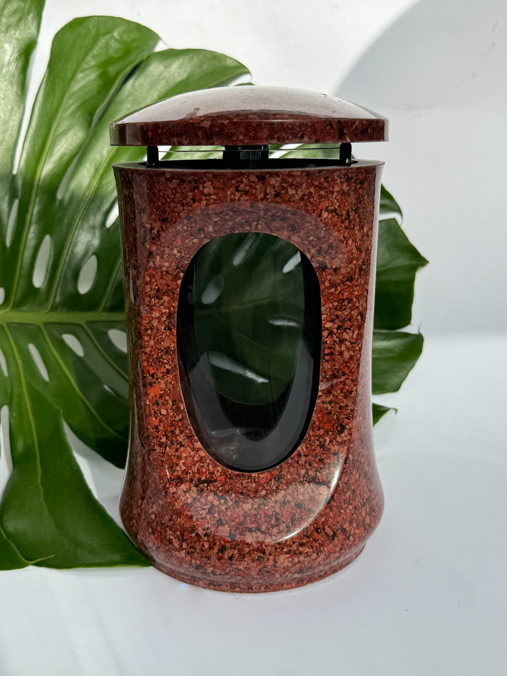Atsparus šalčiui, ilgalaikio naudijimo, aukštos kokybės, raudonos glazūruotos spalvos akmens masės (lydinio) žibintas skirtas kapams su atspariu karščiui stiklu.