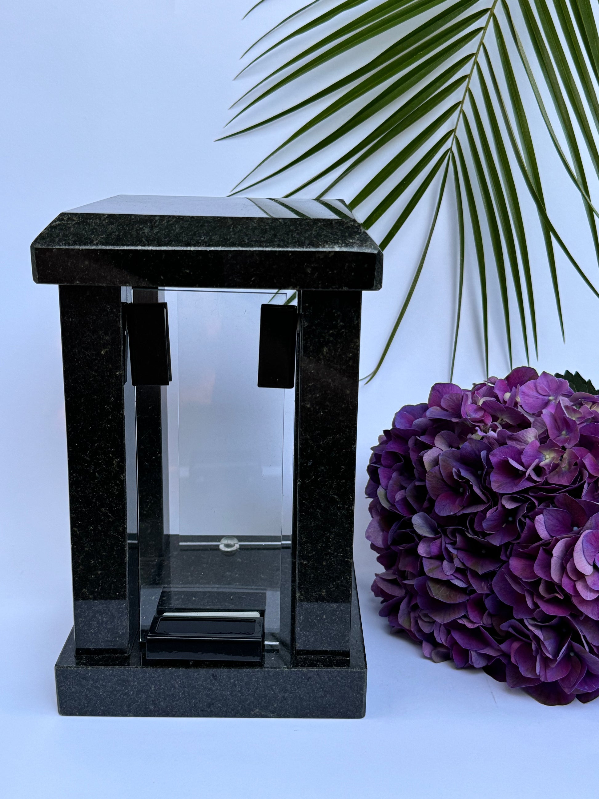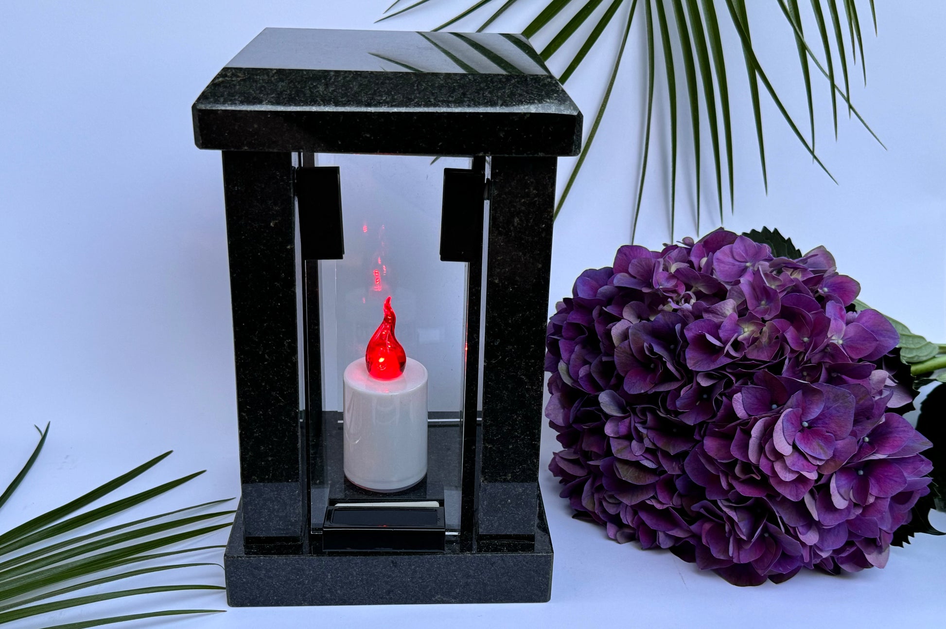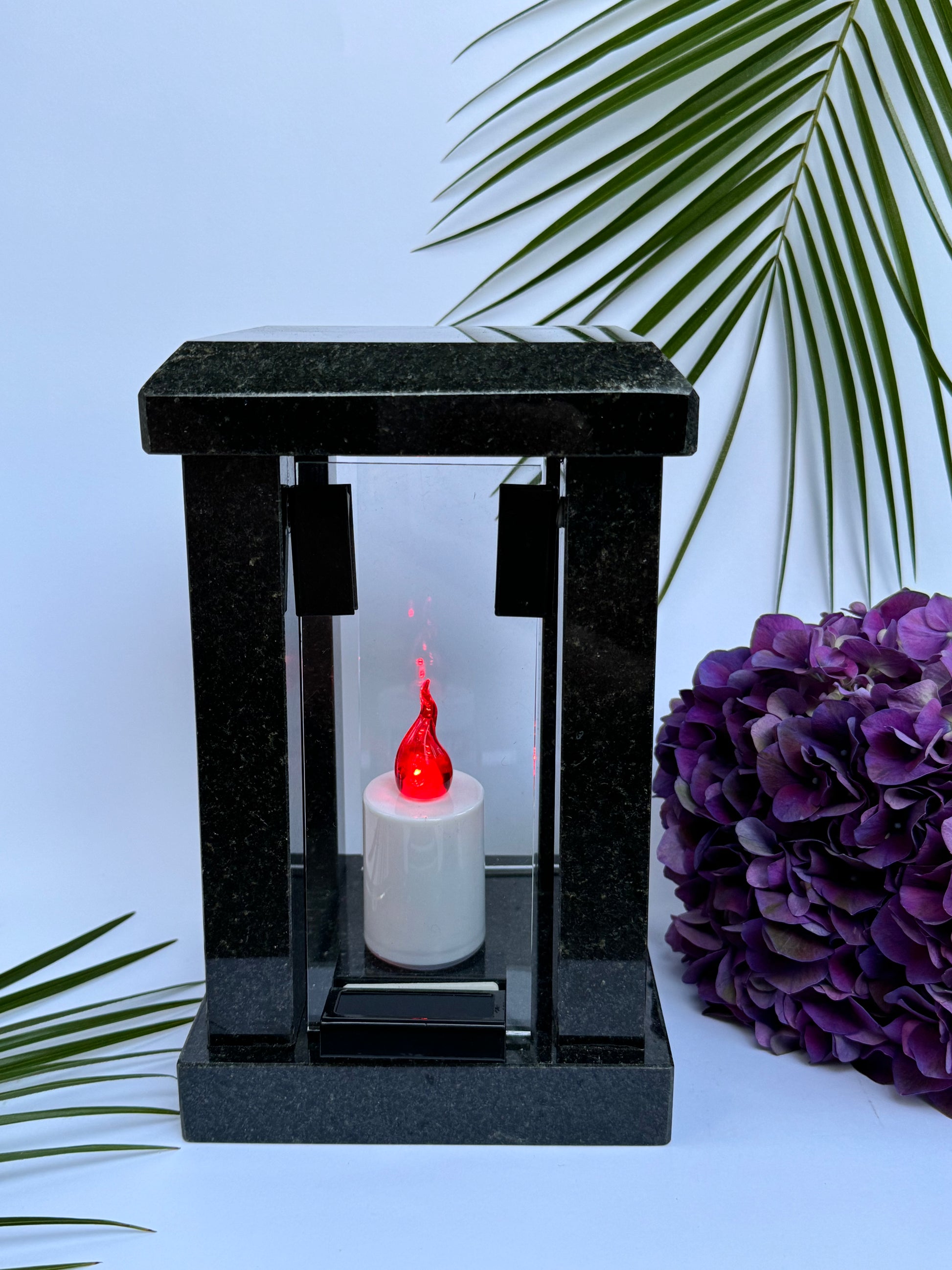 Atsparus šalčiui, ilgaamžis, aukštos kokybės, juodos spalvos granitinis žibintas (žvakidė) skirtas kapams.