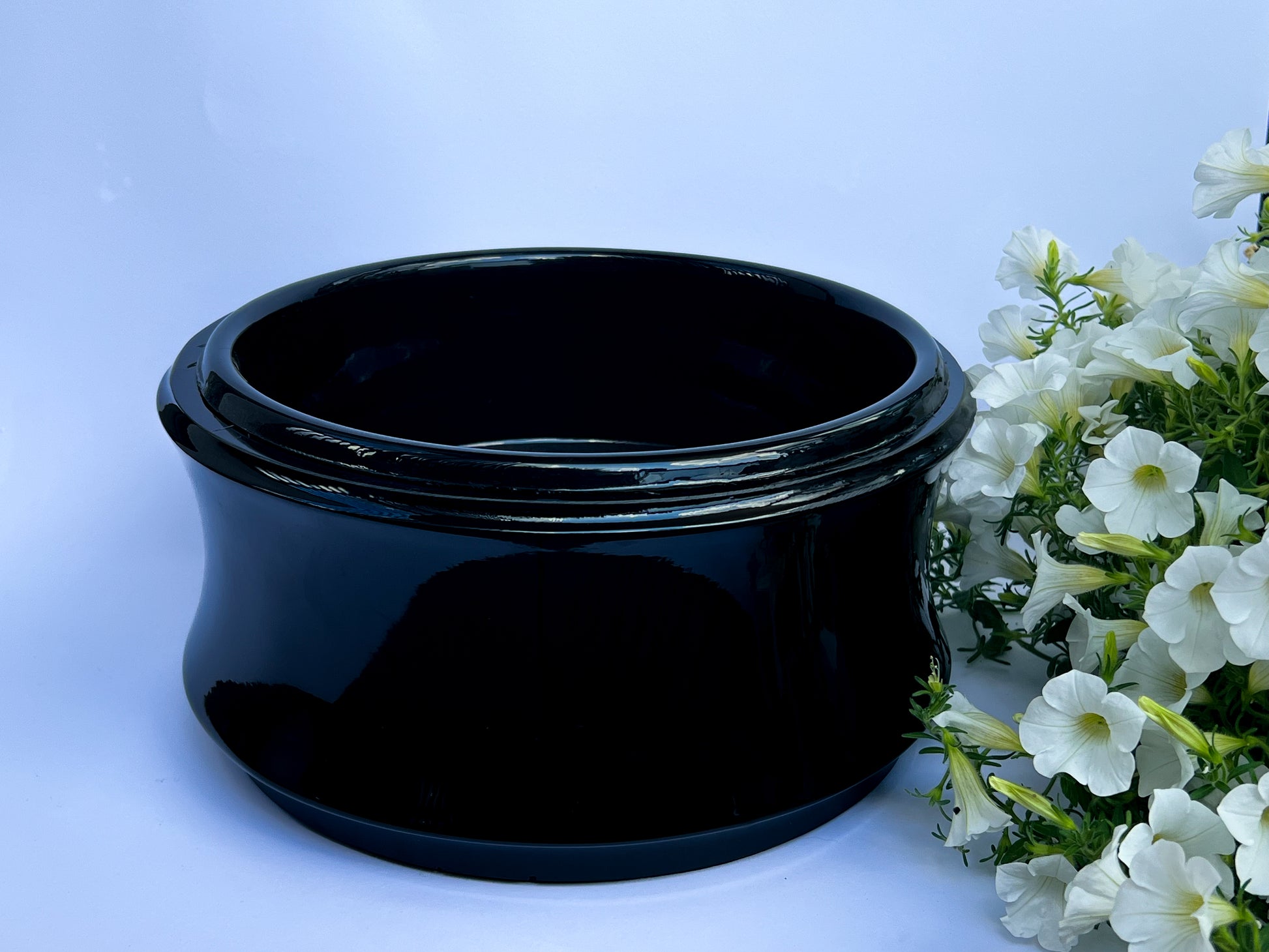 Vidutinio dydžio Juodos glazūruotos spalvos, masyvus akmens masės (lydinio) vazonas su išimamu plastikiniu įdėklų skirtas gyvų gėlių sodinimui, dirbtinėms puokštėms. Pritaikytas naudoti kapuose.