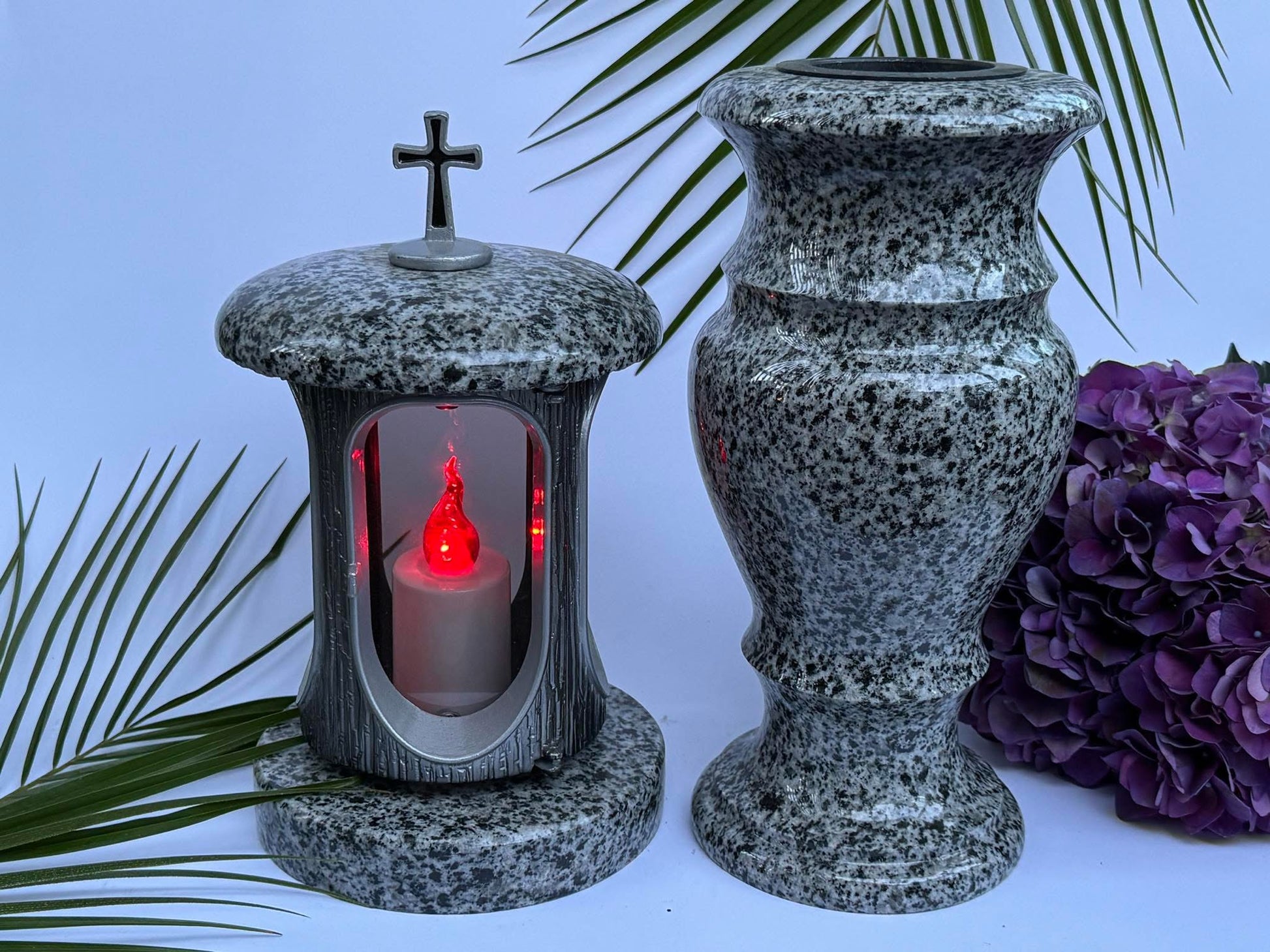Prabangus, kokybiškas kapų žibinto bei vazos rinkinys.