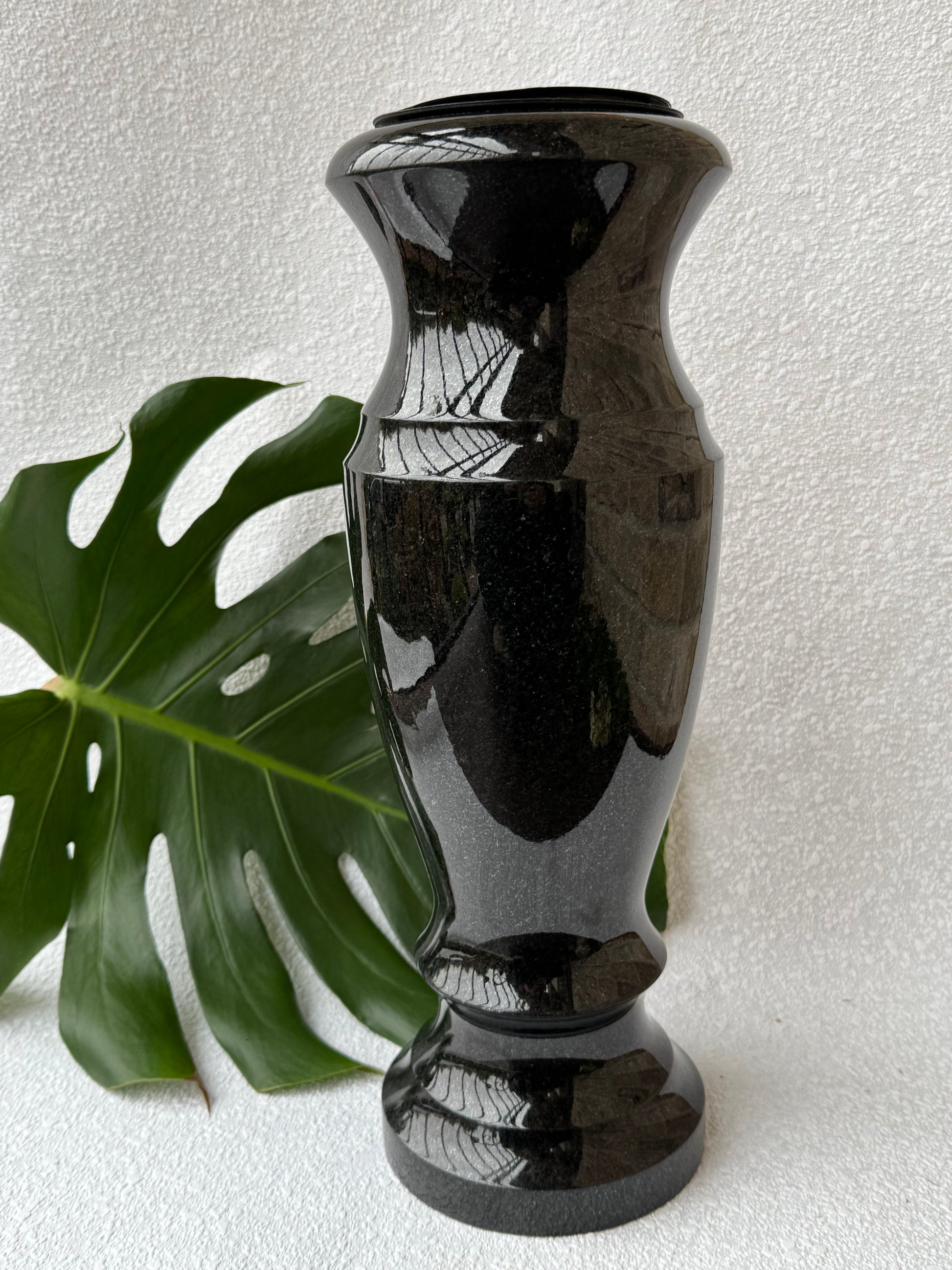 Ypatingai prabangi, rankų darbo, pagaminta iš juodo granito kapų vaza.