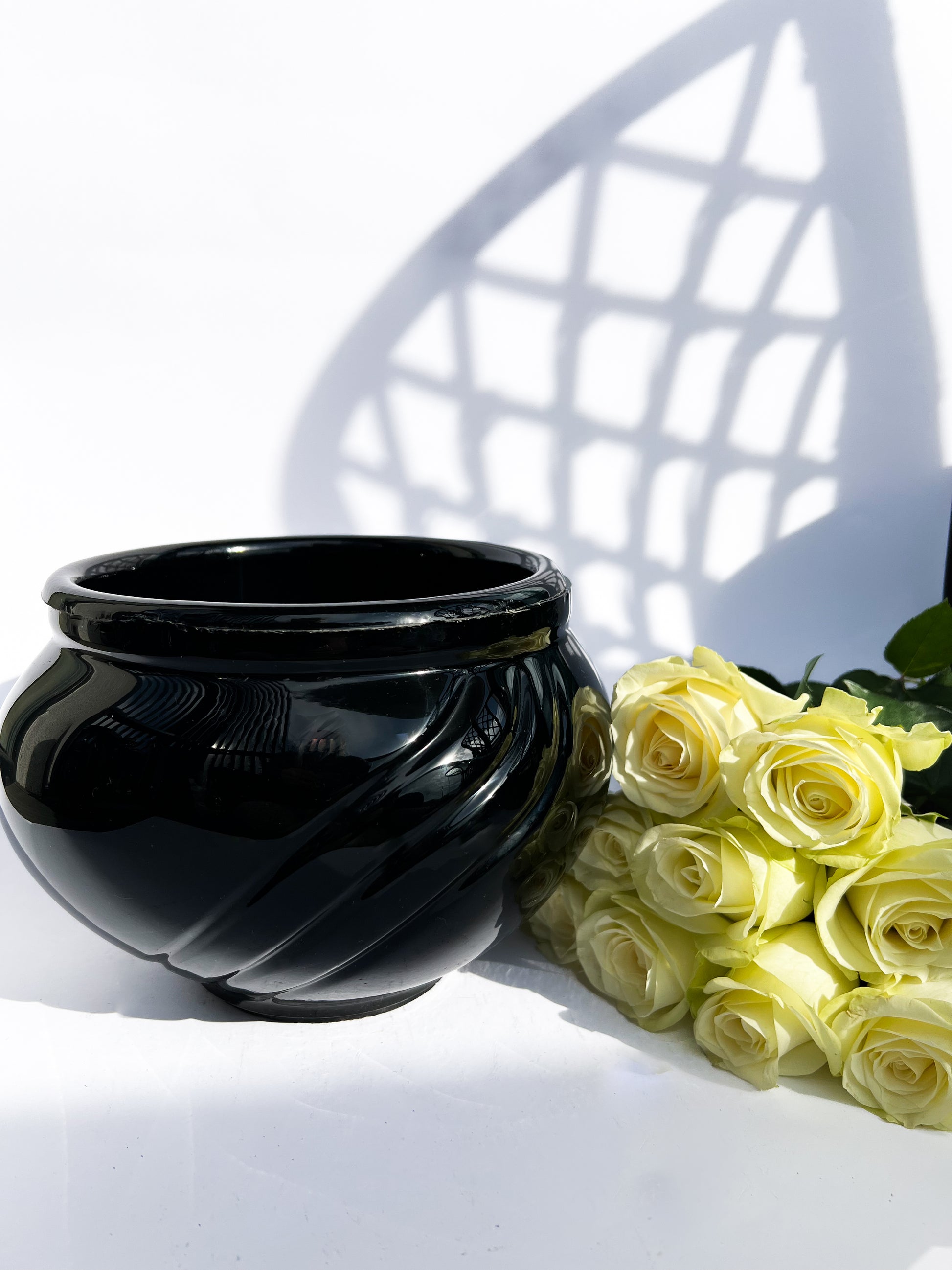 Juodos glazūruotos spalvos akmens masės (lydinio) vazonas su išimamu plastikiniu įdėklų skirtas gėlių sodinimui, dirbtinėms puokštėms. Pritaikytas naudoti kapuose.