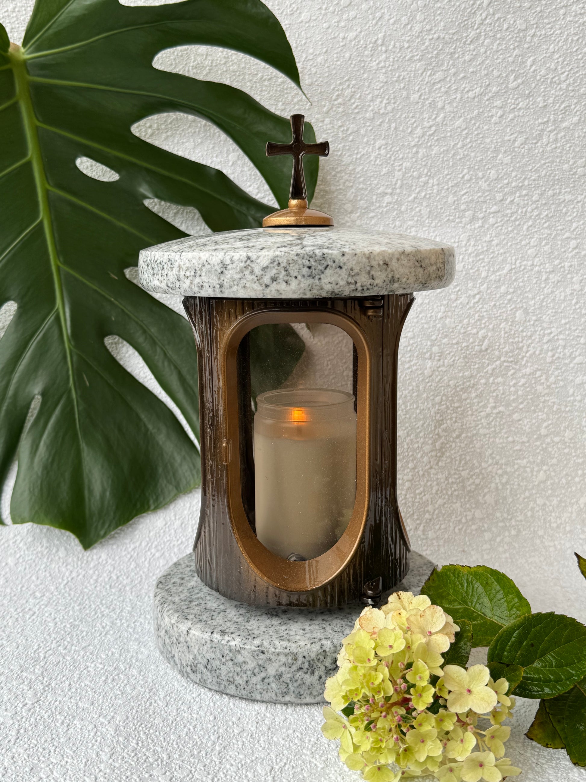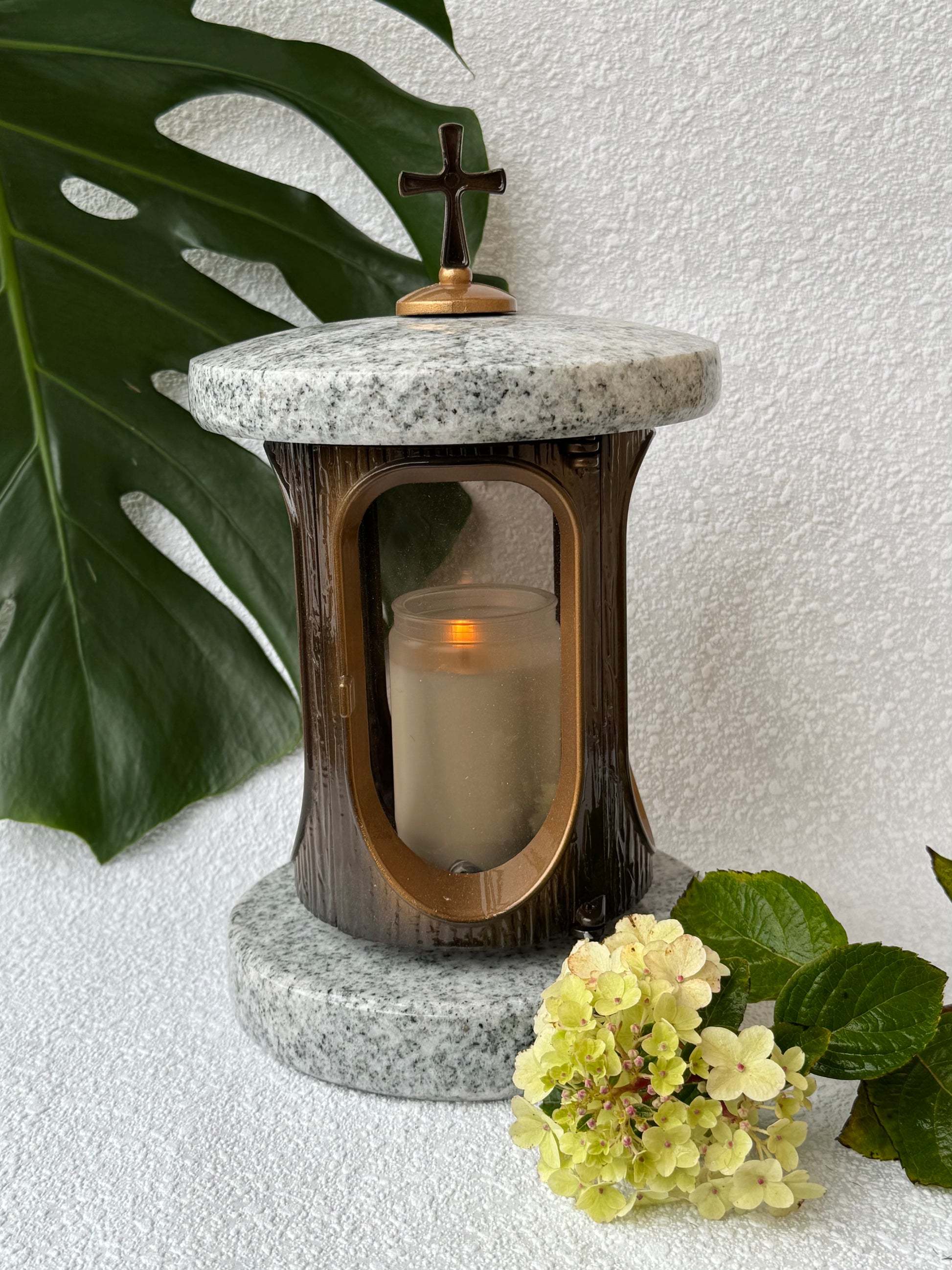 Atsparus šalčiui, ilgaamžis, aukštos kokybės, juodos spalvos granitinis žibintas (žvakidė) skirtas kapams su atspariu karščiui stiklu.